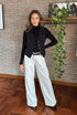 Pantalón blanco con rayas negras de nylon estilo sastre, con elástico trasero.