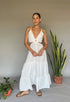 Vestido de nanzú blanco estilo paño gasa con corte cut out y espalda con amarre. Talla única.
