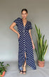 Vestido de chalis azul estampado con puntos. Escote en V, botones delanteros y manga puff.