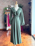 Vestido de tela Viena con detalle recortado en cintura y escote en V con bobo.